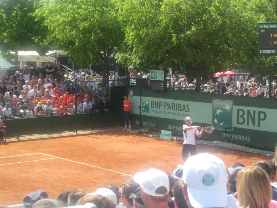 Paseando por las canchas también era increíble ver como los jugadores entraban, salían o caminaban simplemente por algún lugar en Roland Garros, que increíble era solo el hecho de verlos... Encontré un jugador de Alemania , Becker no estoy seguro de cómo se escribe pero él me hizo recordar ese sentimiento que siente el jugador, porque los de afuera simplemente opinan acerca de lo de adentro, pero el que juega pasa por muchas fases mentales, el cada vez que su oponente llegaba a pelotas imposibles o metía unos Winners increíbles, preguntaba en voz baja: “¿Por qué sigue jugando?”.. Y eso me quedó en la cabeza, porque yo nunca me concentré en mi oponente cuando jugaba, simplemente asimilaba que él quería ganar al igual que yo, pero nunca me había preguntado eso, y el mismo (Becker) se respondía: “no existe otra oportunidad más que la de hoy para jugar como nunca antes has jugado tenis”.... Eso quedó de recuerdo, no sé si habrá ganado, pero me quedaré con su frase....